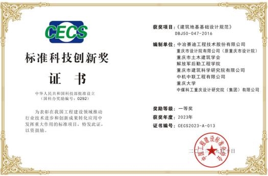 中國工程建設標準化協會標準科技創新獎是經科技部國家科學技術獎勵工作辦公室批準的我國工程建設標準化領域首個專屬獎項,旨在表彰建筑建材、鐵路交通、水利電力、市政工程、機械電子等我國工程建設領域推動行業技術進步和創新成果轉化應用中發揮重大作用的標準項目、單位和個人。市建科院公司副總經理、總工程師張京街從事建設工程質量檢測工作39年,兼任重慶市建筑行業專家庫專家;主持參與編制標準多項,其中作為主編完成國家標準、行業標準、地方標準共10先后獲得全國建設工程質量檢測行業先進個人、重慶市杰出人才突出貢獻獎、重慶市學術技術帶頭人等榮譽。此次獲獎的《建筑地基基礎設計規范》(DBJ50-047-2016)為我國首部山區地基基礎設計規范該規范結合重慶地區特點,提出的巖石地基、邊坡地基和嵌巖樁承載力設計計算,及山區地基技術等方面,均為國內領先水平。