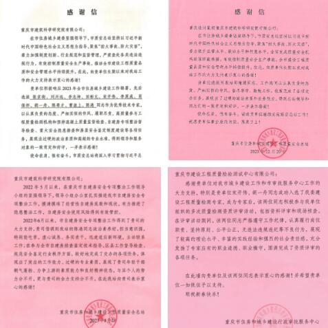感謝信、表揚信紙短情長、信輕情重,承載的是社會各界對市建科院公司工程建設成果最好的肯定,也是對公司強化國企責任擔當、服務民生福祉的高度認可和贊揚。未來,公司將帶著這份這份贊譽和認可,不忘國企初心,踐行國企使命,履行國企擔當,與地方發展戰略緊密結合,以更高的政治站位、更廣的視野格局,發揮優勢、補齊短板、打響品牌,在奮力推動新重慶建設中展現建科力量。