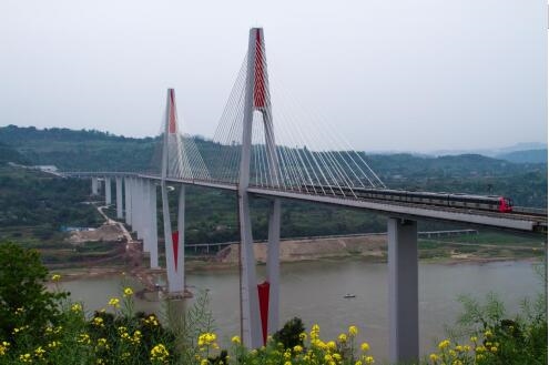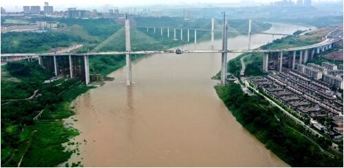 蔡家嘉陵江軌道專用橋為雙線軌道雙索面斜拉橋,全長1250米,由南北引橋和主橋組成,橋跨為連續(xù)梁、雙索面斜拉橋、連續(xù)鋼構(gòu)引橋組成,其中主橋長640米、主跨250米、主橋面距河床距離100米。在設計時兼顧了功能性、景觀性以及可實施性,最終選擇了與環(huán)境協(xié)調(diào),經(jīng)濟實惠、施工可實施性強的斜拉橋,由于橋墩高、橋面窄,主橋?qū)挾认鄬τ谄胀ǖ目缃反髽蚋瑯蛏盹@得纖細,在云霧中呈現(xiàn)婀娜多姿的柔美姿態(tài)。